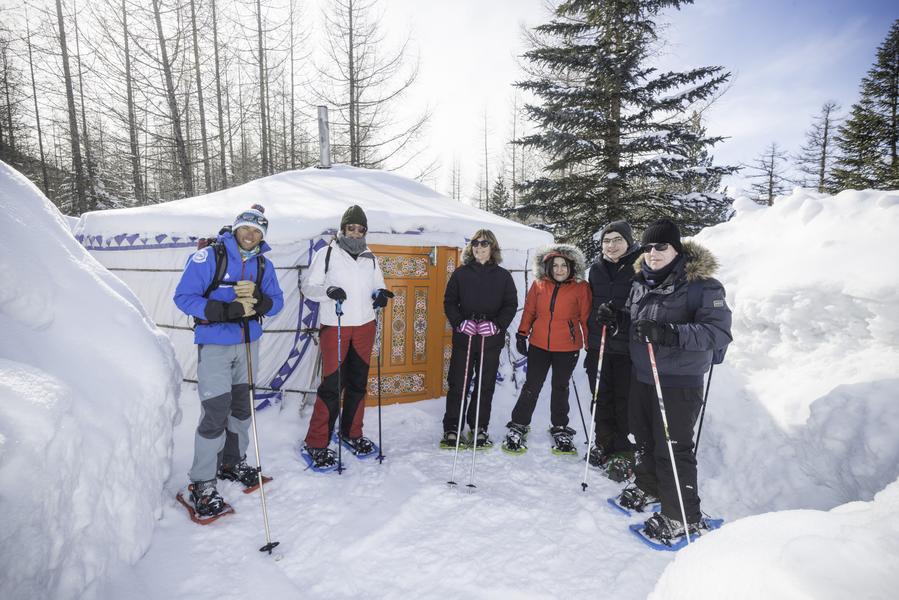 À la tombée du jour, partez en raquettes à travers une forêt de mélèzes enneigés. La magie opère jusqu’à une véritable yourte mongole, où vous attend une fondue royale… une soirée hors du temps, pleine de rêve et d’énergie.
